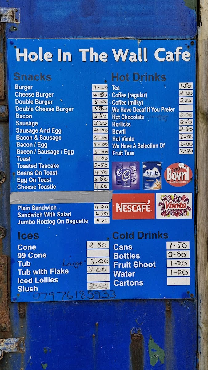 As you step inside, you're greeted by the tantalizing aroma of freshly cooked comfort food. Hole In The Wall boasts a menu filled with hearty snacks that include offerings like succulent burgers, delicious bacon and sausage butties, and toasted teacakes. Whether you’re in the mood for a classic cheese toastie or a filling double burger, each dish is prepared with care and attentiveness to satisfy your cravings. The café also serves up a selection of hot and cold drinks to complement your meal, including refreshing options like Fruit Shoot and a variety of teas and coffees.